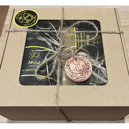 Jeden miód 1,2 kg i dwa miody 0,5 kg zapakowane w pudełko, drewniany nabierak do miodu. Idealne na prezent.